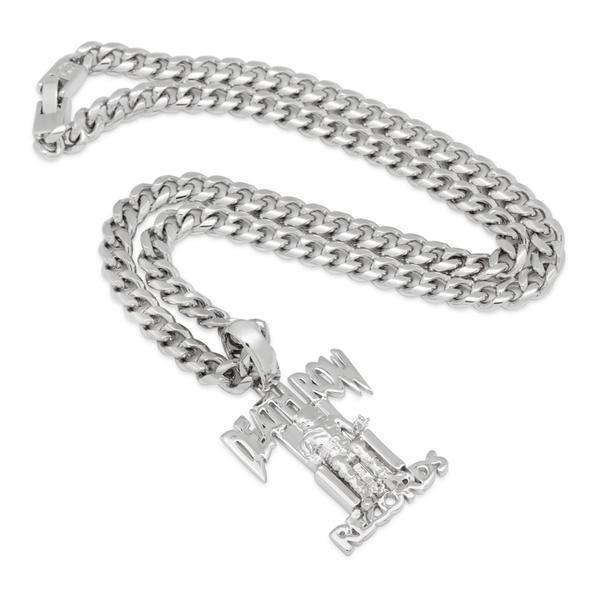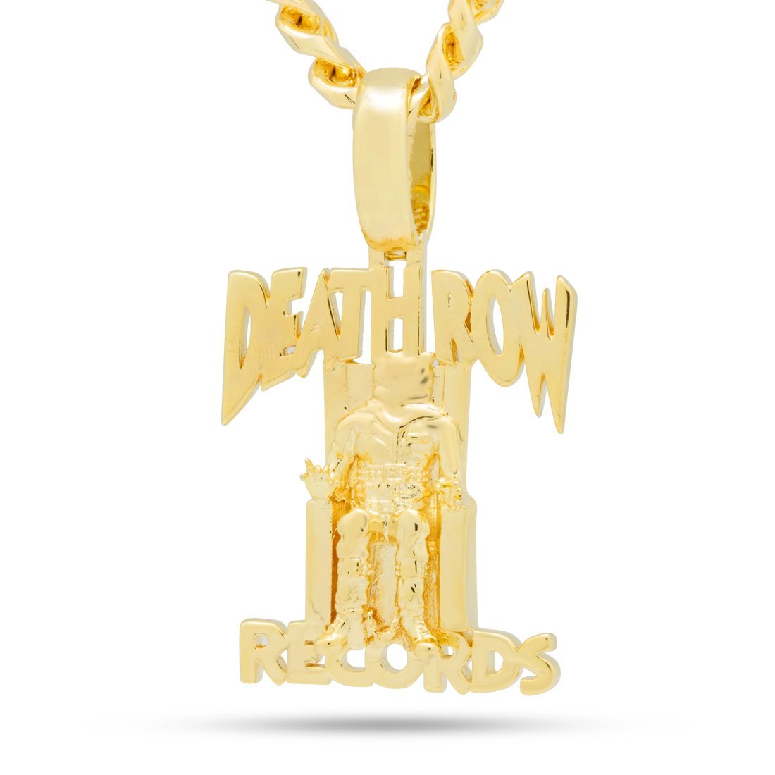 Part of the official King Ice x Death Row collaboration, the infamous chain is now available in .925 Sterling Silver. The Death Row necklace perfectly resembles the iconic brand label. The piece comes in 14K Gold plating and white gold plating. Each piece is paired with a .925 Sterling Silver 8mm, 24" Miami Cuban Curb chain.