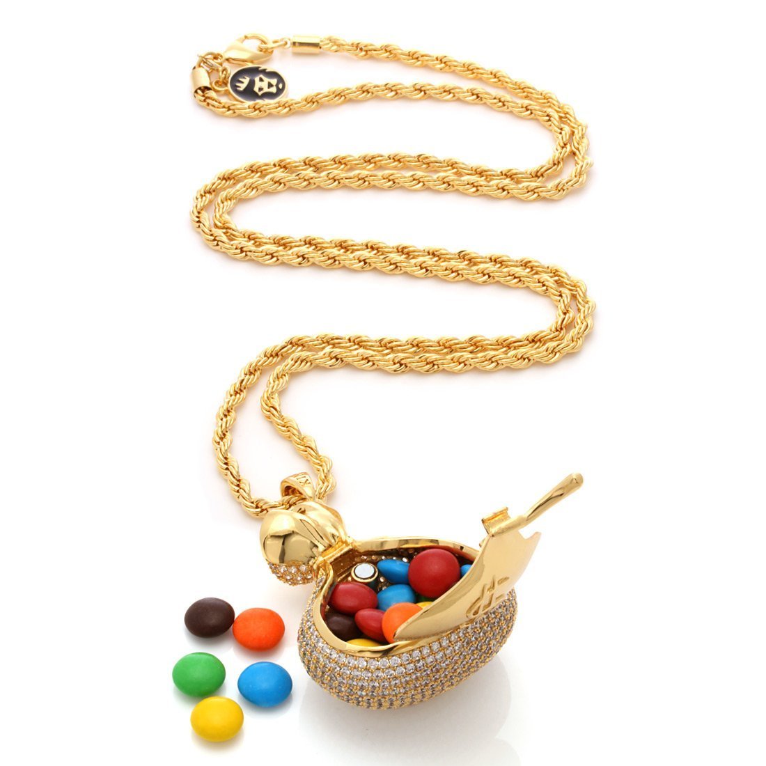 Similar to the original Money Bag comes this Jungl Julz edition that features clear CZ stones to create its studded look, and like its predecessor, includes a hidden stash to store all your goods. Each Studded version includes a matching 24", 4mm rope chain to give this piece its iconic look and feel. The piece is available in 14K Gold plating, white gold plating and rose gold plating.